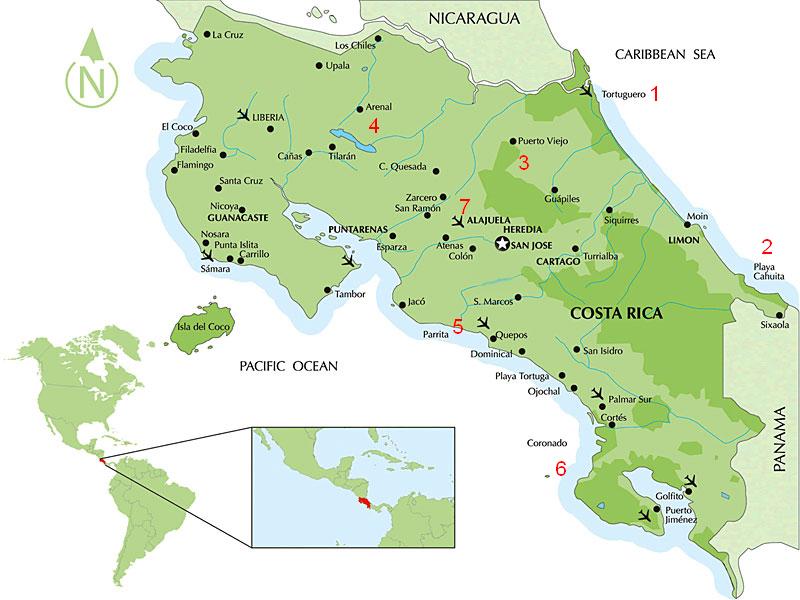 Countries Near Costa Rica Map. Sandwiched between the Pacific and Atlantic oceans and packed with pristine national parks, surf-swept beaches and cloudforests teeming with exotic birdlife, Costa Rica is one of the most biodiverse countries on Earth. To the west, it meets the Pacific Ocean, and to the east lies the Caribbean Sea. Regional Maps: Map of Central America, World Map. The map shows Costa Rica and neighboring countries with international borders, the national capital San José, province capitals, major cities and towns, main roads, railroads and major airports. But, Costa Rica packs a lot into this small territory, with a diverse variety of climates, landscapes, and lifestyles. These include; Papagayo, Coco, Flamingo, Tamarindo, Carrillo, Los Sueños Herradura, Jaco, Quepos, Golfito, Arenal, and Rio.