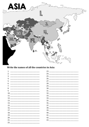 Asia Countries Numbered Map Answer Key. Begin by downloading the labeled map of Asia to learn the countries, and finish by taking a quiz by. This map of Asia has borders shown, but does not list country names.. There are many different things you can do with this map too. Click on an area on the map to answer the questions. That means you can choose which one suits your class best. Use map skills to learn about the world's continents with this political map of Asia worksheet pack.
