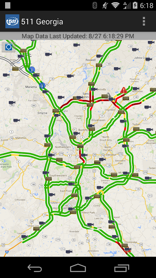 Atlanta Ga Traffic Map. By using this website, you accept the terms of our. List of traffic cameras and their live feeds. Find local businesses, view maps and get driving directions in Google Maps. County Boundary Group of clustered icons on the map. Zoom in Closer How to use the Atlanta Traffic Map Traffic flow lines: Red/White dashed lines = Closed Road, Red lines = Heavy traffic flow, Yellow/Orange lines = Medium flow and Green = normal traffic. Interactive Maps Department of Transportation provides quality infrastructure improvements to better the safety, equity, and mobility of our community.